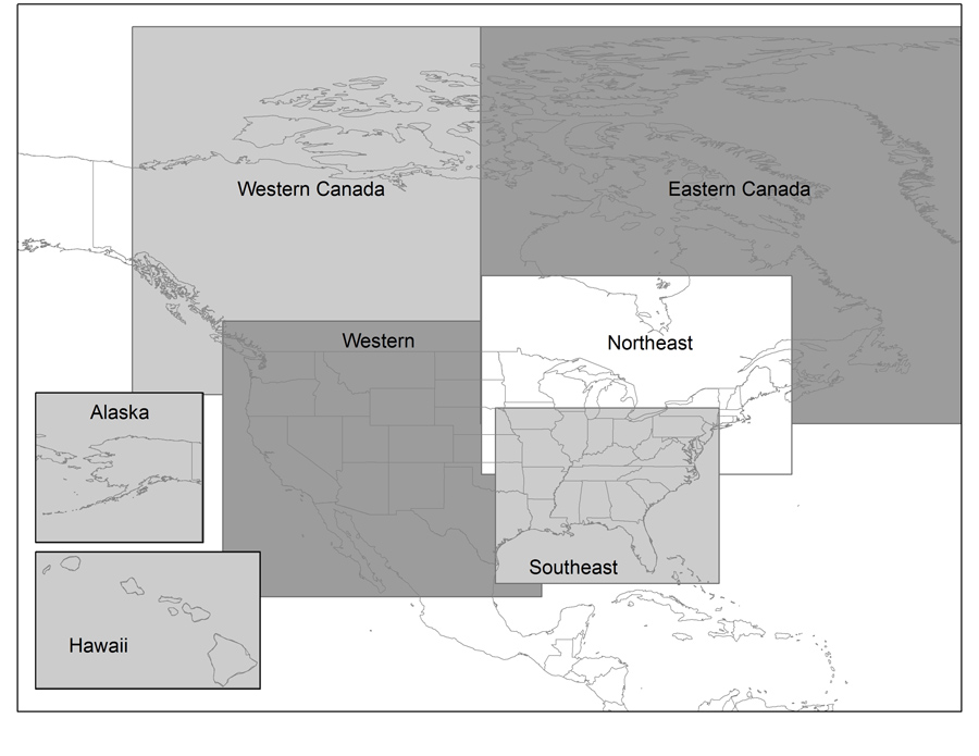 Click on the relevant box for a regional map. Or click here for a full size map of all North American stations.